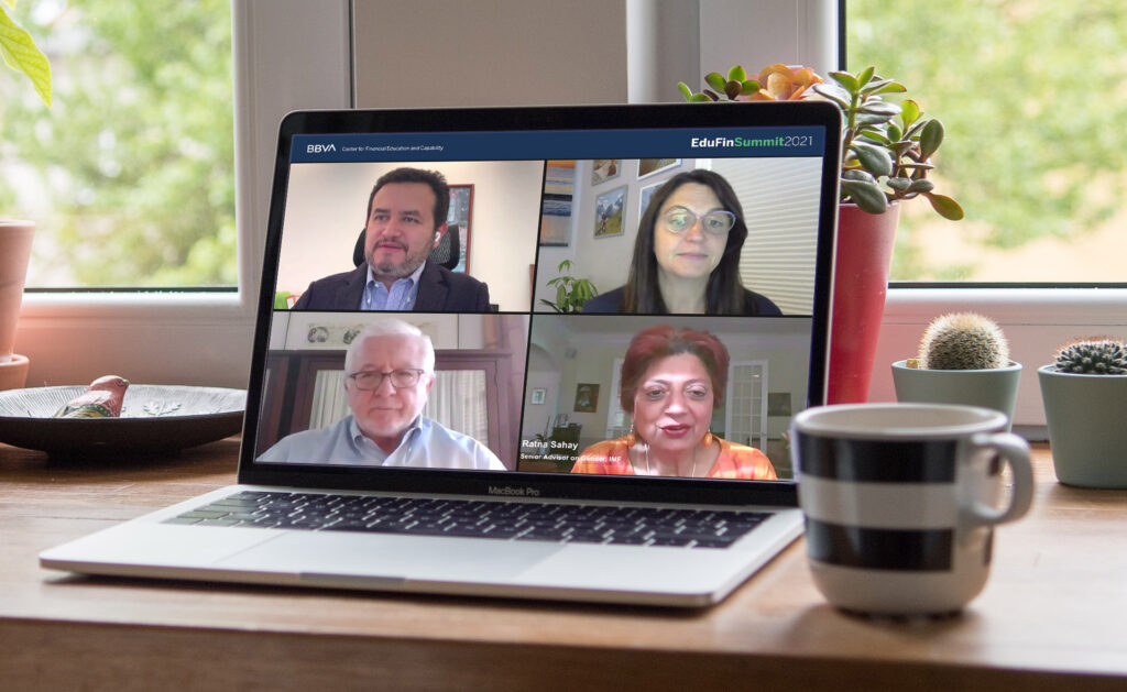 Andrés Portilla, director de Asuntos Regulatorios del Institute of International Finance (IIF), en el papel de moderador; Juan Antonio Ketterer, jefe de la División de Conectividad, Mercados y Finanzas del Banco Interamericano de Desarrollo (BID); Leora Klapper, economista principal del Grupo de Investigación para el Desarrollo del Banco Mundial y Ratna Sahay, asesora principal en Género del Fondo Monetario Internacional (FMI), han sido los protagonistas de la segunda sesión de la cumbre global de educación financiera de BBVA, EduFin Summit 2021.