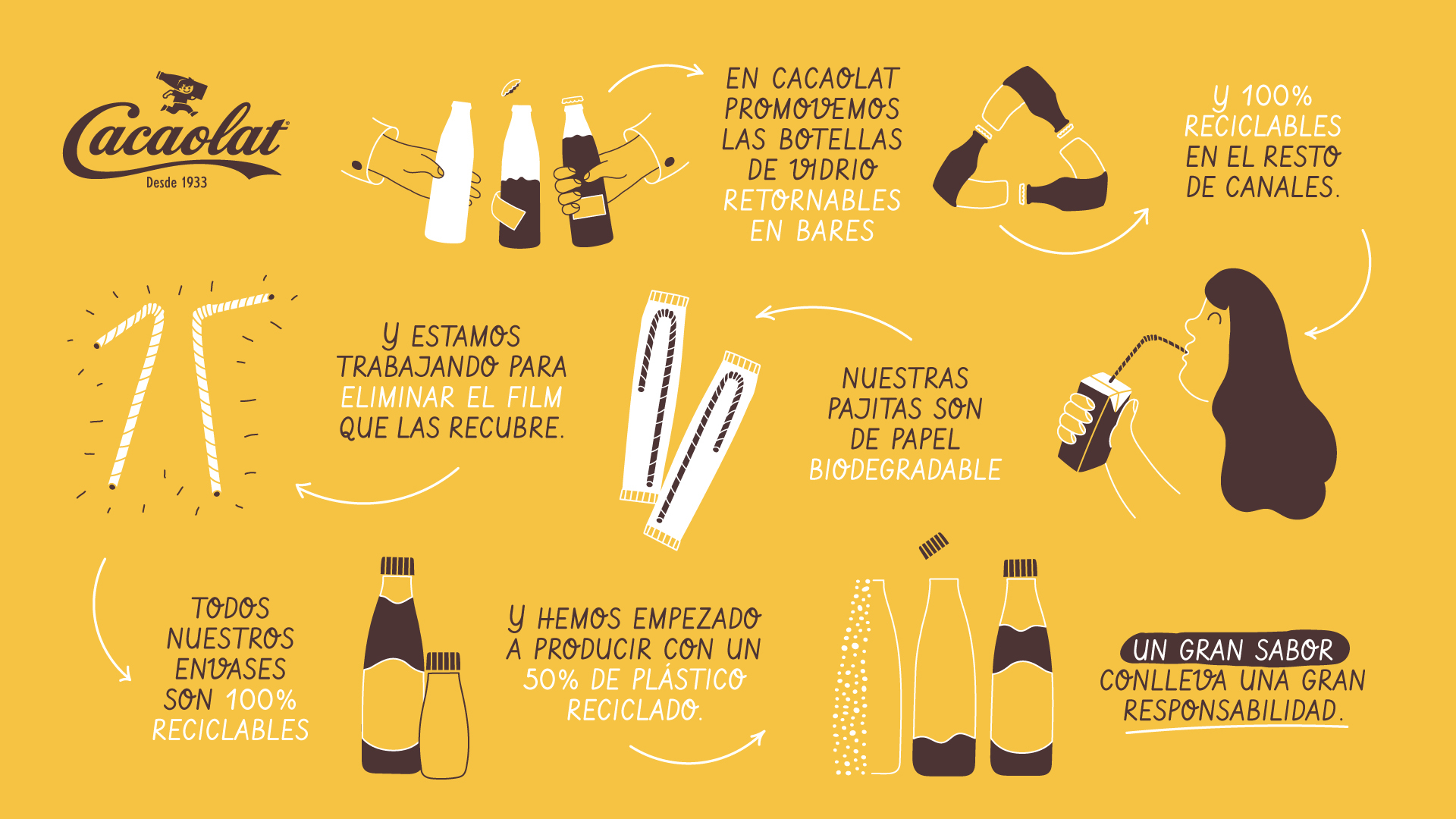 A lo largo de los años, Cacaolat ha sabido adaptarse a las necesidades de un consumidor cada vez más consciente y comprometido con el medio ambiente. Por ello, sigue y seguirá apostando por llevar a cabo iniciativas sostenibles ya que “un gran sabor conlleva una gran responsabilidad”.