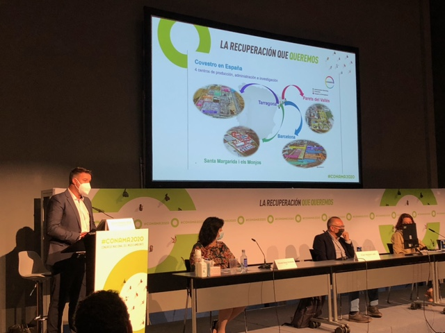 Iglesias ha presentado la tecnología de CO2de Covestro mediante la cual la compañía convierte el gas de efecto invernadero CO2 en una materia prima útil en los procesos de producción, lo que le permite ahorrar una quinta parte del petróleo crudo, el material convencional en el sector químico.