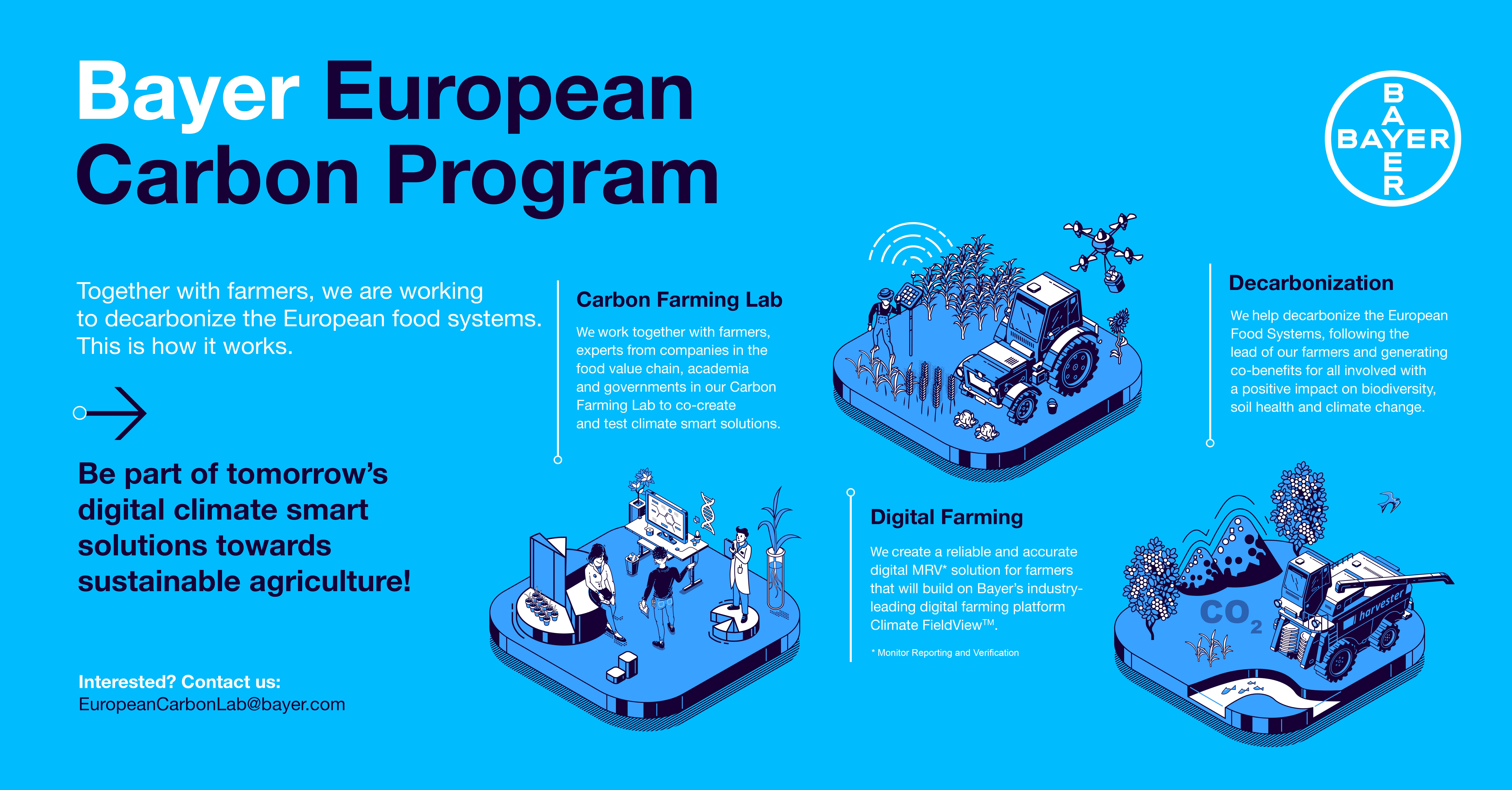 Este lanzamiento europeo es parte de la Iniciativa Global de Carbono (Global Carbon Initiative) de la compañía que se lanzó en los Estados Unidos y en Brasil en julio de 2020, donde Bayer es la primera empresa agrícola en ofrecer toda la tecnología necesaria en términos de semillas y rasgos, protección de cultivos y soluciones digitales, MRV rentable, y certificación de acuerdo con estándares reconocidos internacionalmente.