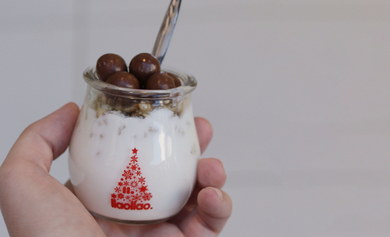 Se trata de una ración de su yogur fresco y natural elaborado de forma artesanal en una granja de Cantabria en exclusiva para llaollao, servido en un tarro de vidrio reutilizable y 100% reciclable, y completado con varios toppings de Nestlé y muesli.