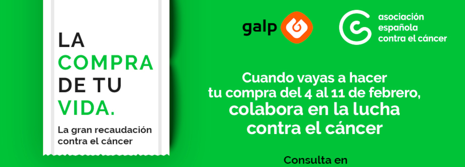 En el marco del Día Mundial contra el Cáncer, desde mañana 4 de febrero y hasta el día 11, 270 estaciones de servicio de Galp se unirán a la campaña ‘La compra de tu vida’ como puntos oficiales para realizar los donativos. Durante el periodo que dura la campaña, Galp ofrecerá la posibilidad de ampliar el importe del ticket de compra con un donativo que puede ir desde un euro hasta la cantidad que cada uno desee (hasta un máximo de 99€ en caja) transformándose en ayudas directas a la AECC.