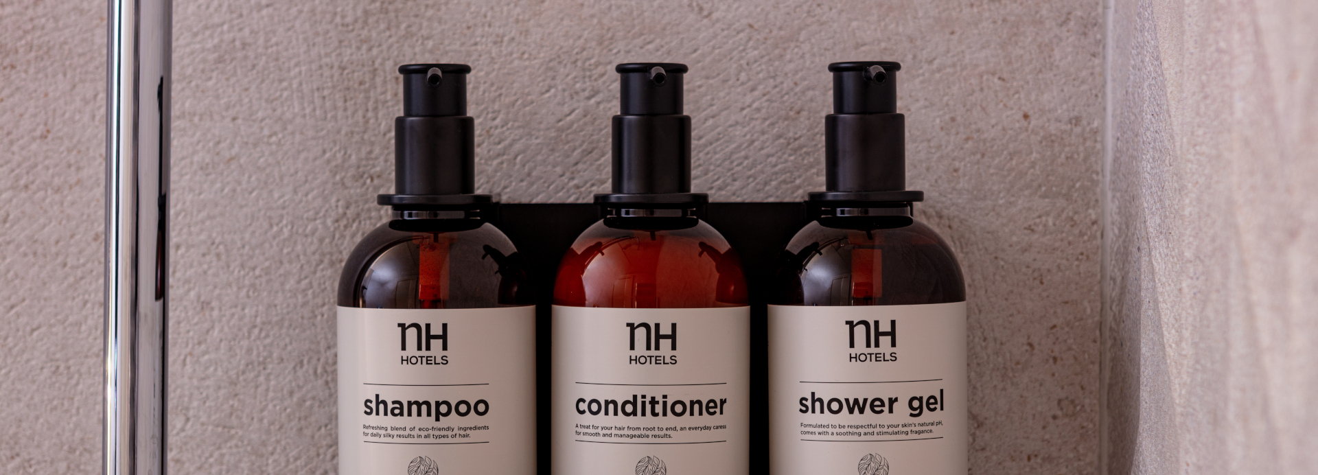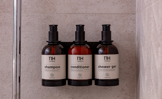 A partir de ahora, al entrar en los baños de una habitación de cualquier hotel NH Collection, NH Hotel, Tivoli, Avani o nhow, el viajero encontrará dispensadores fijos de pared junto a la ducha y el lavabo, fabricados en pet reciclado y 100% reciclable. Además de los dispensadores, también se han cambiado todos los accesorios como pueda ser el peine o el cepillo de dientes. Estos son todos fabricados con materiales sostenibles (caña de trigo, PSM -almidón de maíz- y fibras naturales) y su packaging es de cartón 100% reciclado y reciclable, impreso en tinta de soja y sin barnices. El diseño de estos dispensadores y el resto de los envases está inspirado en los productos tradicionales de las boticas de siempre con un toque sofisticado y actual que evoca calidad, naturalidad y respeto por el medio ambiente. En el caso de los dispensadores y accesorios de la marca nhow el diseño es moderno y acorde a la estética de esta.