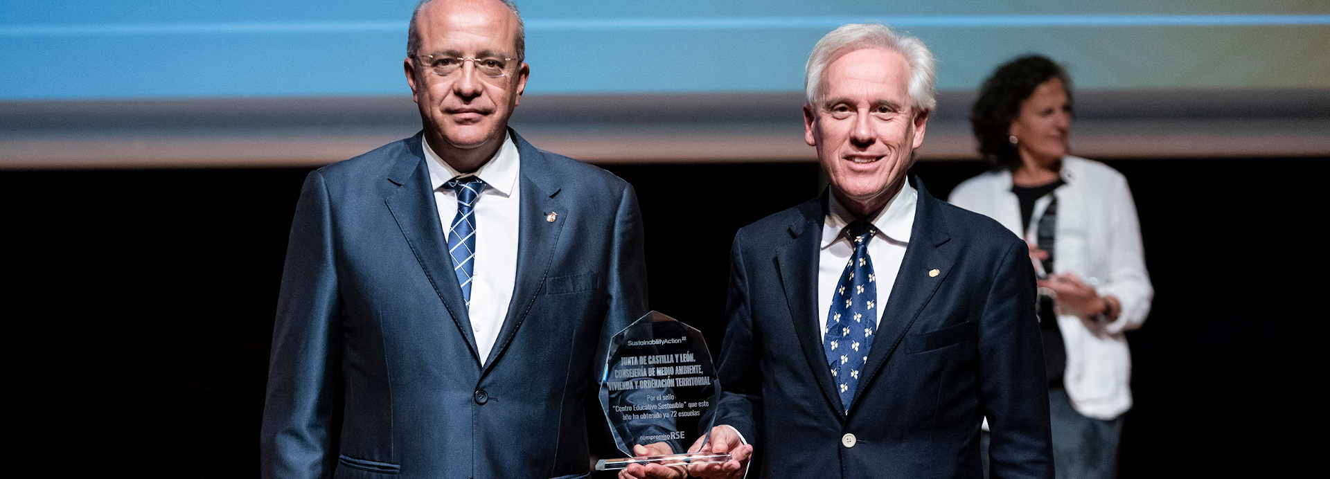 El viceconsejero de Medio Ambiente y Ordenación del Territorio, Rubén Rodríguez, y el director general de Innovación y Formación del Profesorado, Luis Domingo González, han sido los encargados de recoger el reconocimiento otorgado por CompromisoRSE el pasado mes de octubre en el Museo Reina Sofía de Madrid.