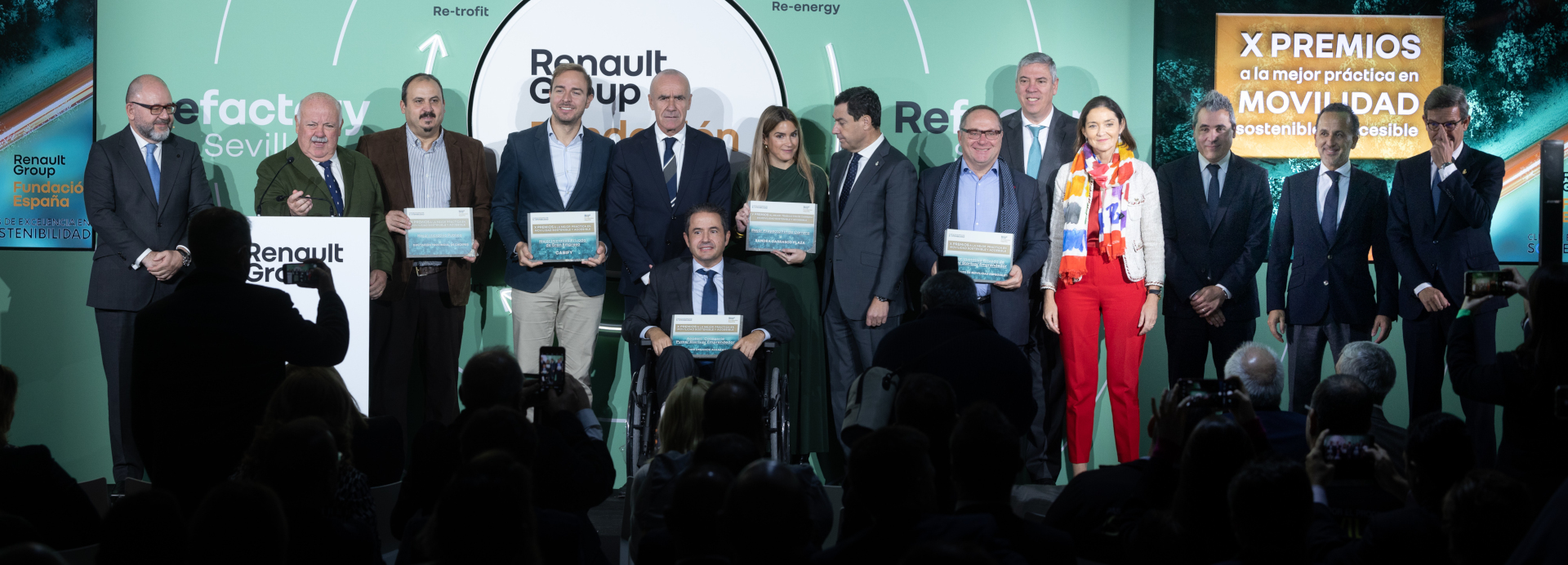 Jesús Presa, presidente de la Fundación Renault Group España, y Carlos Fraile, director de la misma han dirigido una ceremonia en la que los galardones han sido entregados por: Juan Manuel Moreno, presidente de la Junta de Andalucía; Reyes Maroto, Ministra de Industria, Comercio y Turismo; Josep María Recasens, Director de Estrategia y Desarrollo de Negocio y José Vicente de los Mozos, Director Industrial Renault Group y Presidente-Director General de Renault España.