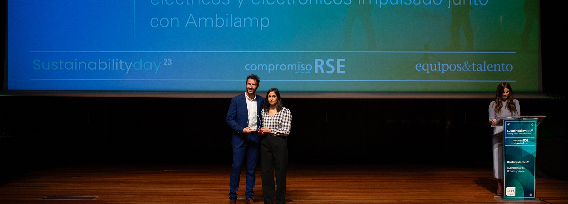 Raquel Ayora, coordinadora de Relaciones Institucionales y Proyectos de Ecotic, y Lucas González, director de Desarrollo de Negocio e Innvoación de Ambilamp, fueron los encargados de recoger el premio. Los reconocimientos Sustainability Actions 23 de CompromisoRSE son unos galardones que reconocen y ponen en valor las iniciativas y los proyectos llevados a cabo a lo largo de 2023 en materia de sostenibilidad, medio ambiente e inclusión social. Con el objetivo de premiar a los principales stakeholders del país, los premios se dividen en seis categorías: Administración Pública, Formación y Centros Educativos, ONG y Fundaciones, Organizaciones, Startups y Empresas.