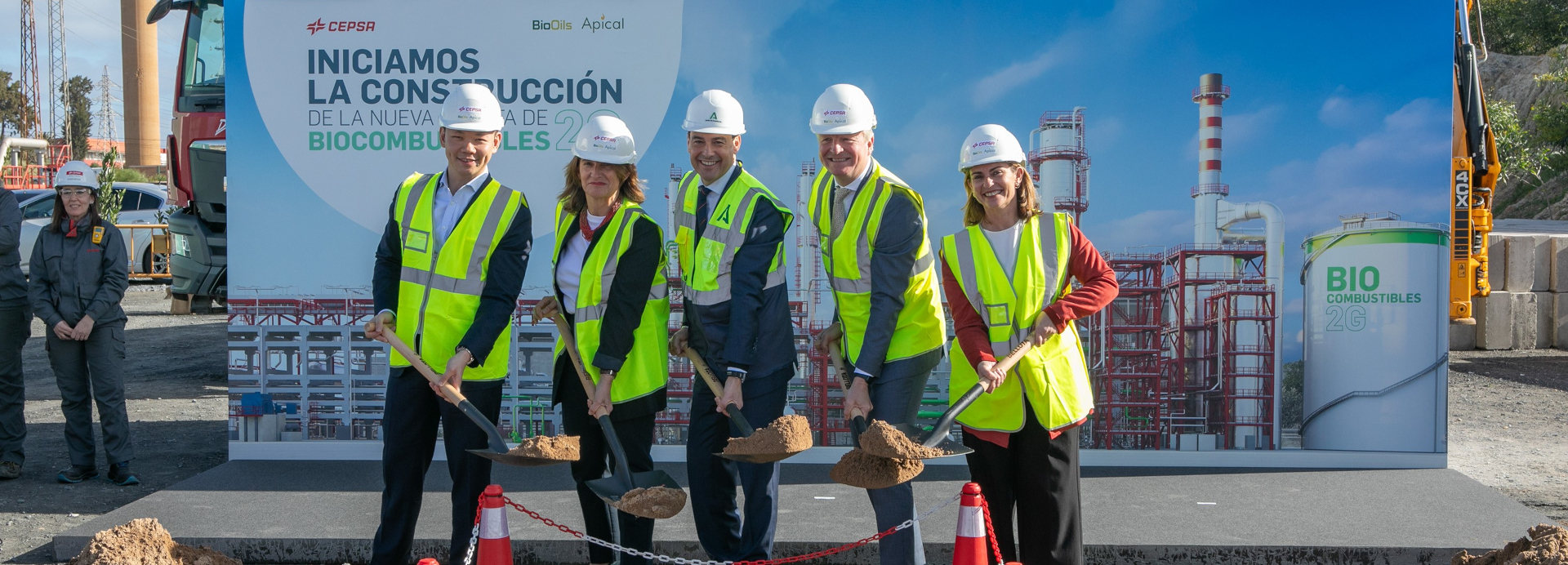 El inicio de la construcción de este proyecto se ha celebrado hoy en un acto que ha contado con la participación de Juan Manuel Moreno Bonilla, presidente de la Junta de Andalucía, Teresa Ribera, vicepresidenta tercera y ministra para la Transición Ecológica y el Reto Demográfico, Maarten Wetselaar, CEO de Cepsa, Anderson Tanoto, director general de RGE, que gestiona un grupo de empresas manufactureras basadas en recursos naturales, entre ellas Apical y Bio-Oils, y Pratheepan Karunagaran, director ejecutivo de Apical.