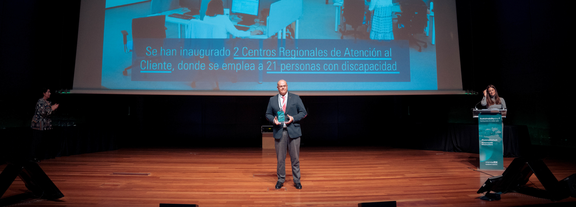 Ignacio Velo, responsable de Alianzas de ILUNION, acudió al evento, recogió el galardón y declaró: “Hemos sido totalmente aliados, sobre todo de las administraciones públicas, de los ayuntamientos, de las diputaciones, del movimiento asociativo, y lo que les hemos ofrecido es, a través de empleo para personas en colectivos vulnerables, poniendo el foco en las mujeres con discapacidad, acompañando de una tecnología, unos centros de atención al cliente en las regiones, los CRACS, con la visión de: allí donde tengas tú tus raíces, quédate, no te vayas y nosotros te damos oportunidades para trabajar. (…) Ahora con la tecnología y con oportunidades de empleo lo que hemos venido a demostrar con el Proyecto Raíces es que se puede crear empleo en aquellos municipios donde no hay oportunidades, sobre todo para este colectivo”.
